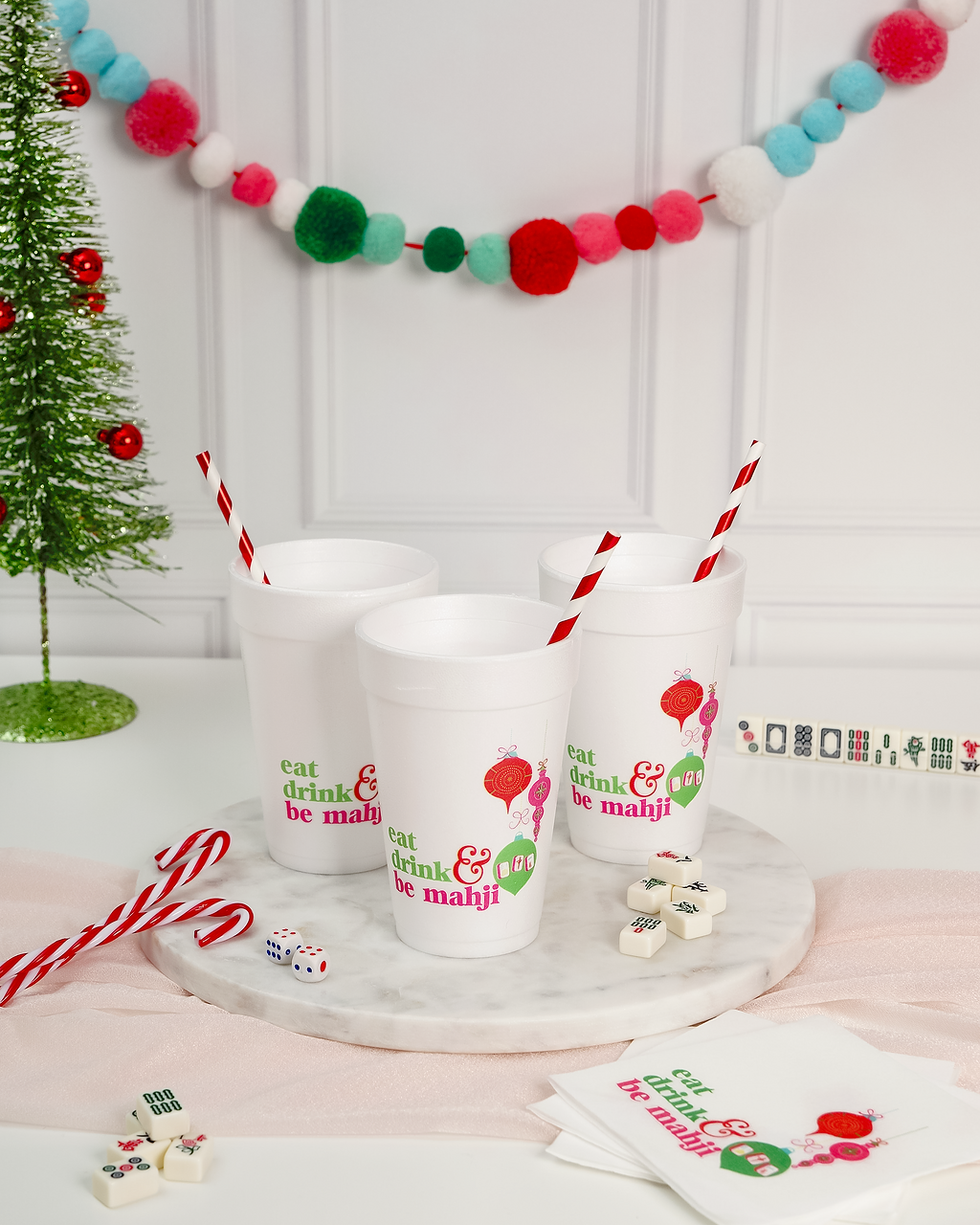 Eat, drink, and be Mahji! Add a festive spin to your holiday gatherings with our Eat Drink and Be Mahji Styrofoam Cups. These playful 16 oz cups bring the fun to your mahjong night, whether you're sipping cider or serving up cocktails.